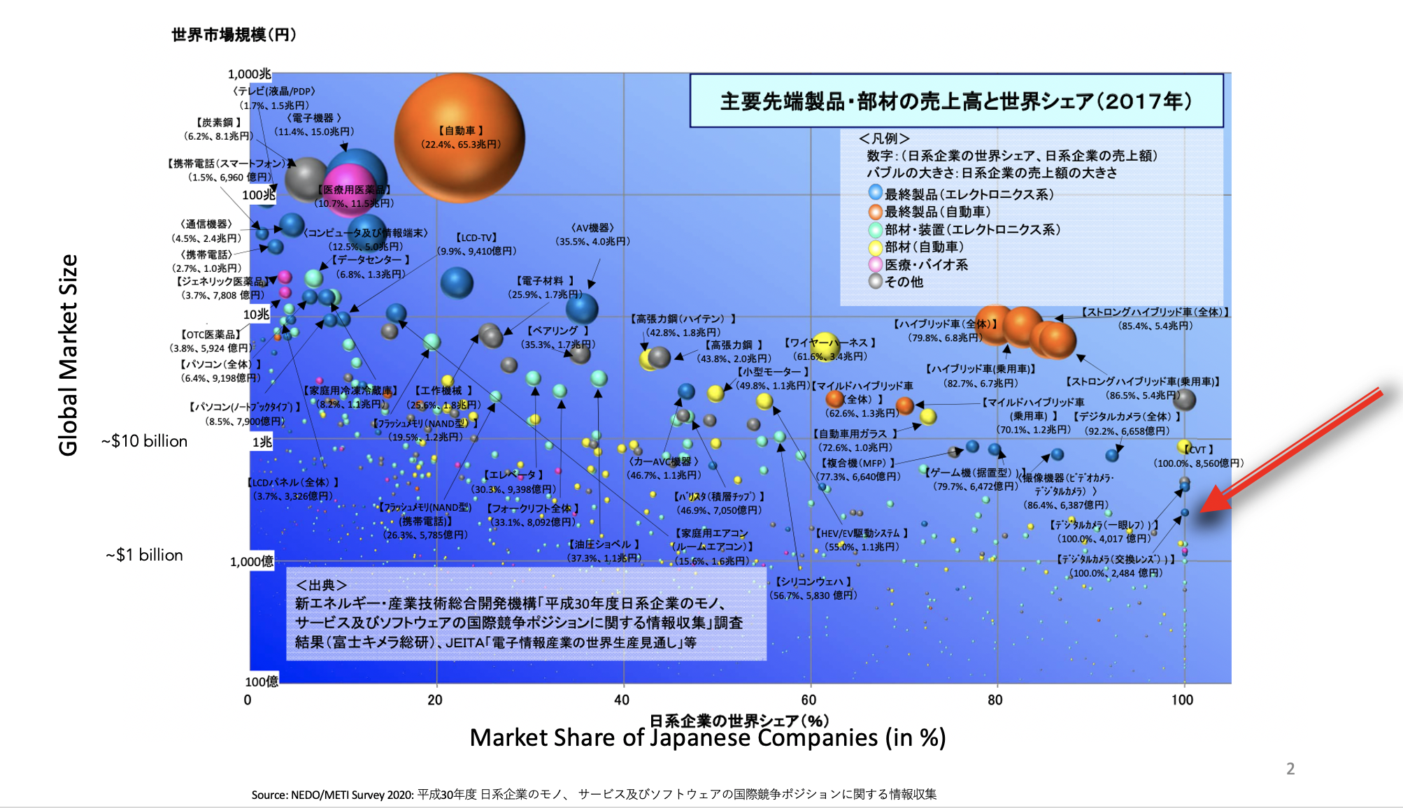Here is a visualization of the “aggregate niche strategy”. The vertical axis is the global market (hence the big orange bubble), and the horizontal indicates the combined share of Japanese companies in that industry. Japanese companies combine for a 100% global market share in many small “bubbles”. And while each of these dots may be small, at about $5 billion per market, these dots add up to significant resource dominance. Each dot represents a product category, and color indicates industry (yellow: car parts, blue & teal: electronics). Orange are automobiles, an industry that Japan has long co-dominated. Blue are intermediate or end products in electronics.